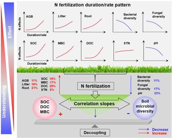 土壤微生物是陆地生态系统遗传多样性的重要组成部分,在陆地生态系统地下碳(C)循环中发挥重要作用。活性氮通过大气沉降的方式进入陆地生态系统,可有效缓解地上植被的氮限制,促进植物生长,增加植物生物量。然而,过多的氮素可能引起土壤pH下降,导致土壤养分失衡,破坏生态系统的稳定性。在土壤碳循环过程中,土壤微生物多样性与土壤有机碳紧密耦合;而这种耦合可能会被快速的全球氮沉降削弱或破坏。目前,对氮沉降如何影响土壤有机碳与土壤微生物有较多认知,但土壤有机碳和微生物多样性的关系如何响应氮沉降尚不清楚。
