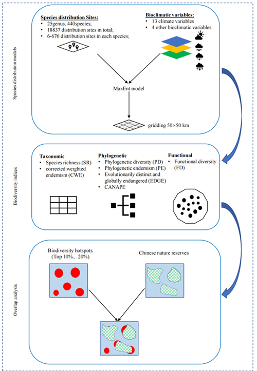 午夜av 西双版纳热带植物园植物系统发育与多样性保护研究团队以最大熵(MaxEnt)模型模拟当前樟科物种的潜在分布为数据基础,利用DNA条形码ITS构建286种中国樟科植物的系统发育关系,并收集了叶面积、株高等物种功能性状,从物种、进化和功能三方面分析樟科多维度的多样性空间分布格局。研究发现,中国樟科各多样性指标呈现出不完全一致的空间分布格局,形态特征的平行进化可能是造成功能多样性和其他指标不匹配的原因,多样性指数之间的脱钩突显了不同多样性的互补性以及它们各自在评估保护价值方面的作用;综合各多样性指标,提出了中国樟科植物重点保护区域位于西藏南部、横断山脉北部、云南南部和东南部以及秦岭和淮河南北分界的区域,而这些区域正是中国亚热带常绿阔叶林与北部的落叶森林、南部的热带森林、西部的高原植被形成的交错区域。该研究强调了综合多维度多样性指标、以实现最大限度保护中国常绿阔叶林生物多样性的重要性,证实并确立了森林交错带对生物多样性保护的重要价值。