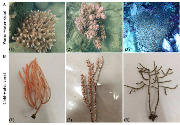 图1. 珊瑚样本(A1-A3,浅水来源的常见热带珊瑚,对照样本;B1-B3,冷水珊瑚样本)