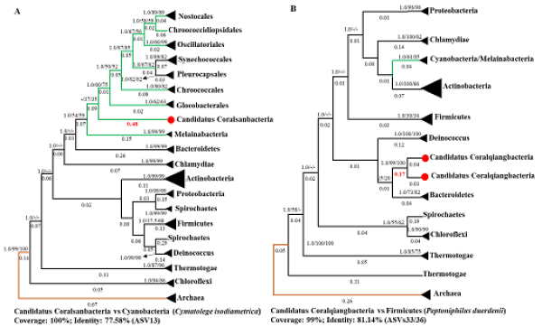 图2. 不同类型珊瑚中检测到的丰度较高的2个潜在的细菌新门(红色圈)