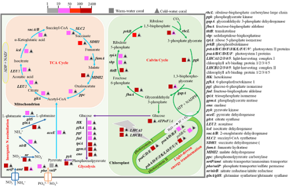 图3. 重构的虫黄藻关键代谢途径(三角形表示冷水珊瑚相关基因)