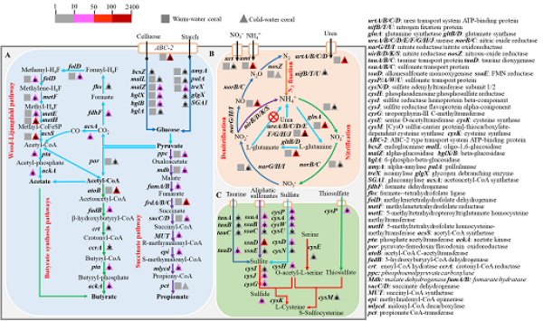 图4. 重构的细菌关键代谢途径(三角形表示冷水珊瑚相关基因)
