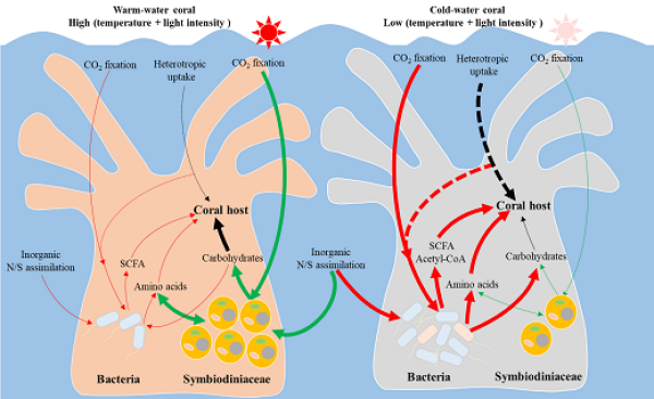 图5. 冷水珊瑚共生微生物及功能模式图(与浅水来源热带珊瑚相比较,左热带珊瑚,右冷水珊瑚)。冷水珊瑚中虫黄藻密度低而细菌相对丰度高;冷水珊瑚中细菌具有较强的无机氮/硫同化,短链脂肪酸合成及非光合二氧化碳固定能力。