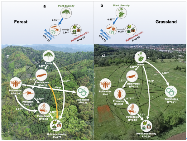 森林和草地生态系统中,植物多样性通过多营养级生物多样性及其相互作用促进生态系统多功能性