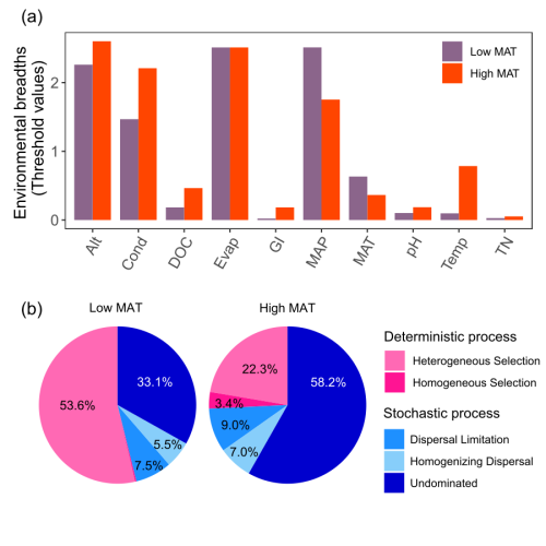 研究表明,年均温是影响青藏高原冰前湖浮游细菌生物多样性的关键因素。年均温升高增加了冰前湖浮游细菌物种丰富度,降低了冰前湖浮游细菌β多样性。研究发现,冰前湖微生物生物多样性发生变化的原因可能是喜冷物种对环境的适应性较差,而喜暖物种表现出更广泛的环境可塑性。因此,随着年均温升高,少量喜冷物种数量减少,大量喜暖物种数量增加。