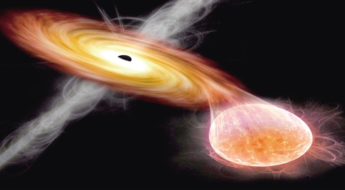 由一颗普通恒星和一个黑洞或中子星组成的双星系统吸积过程示意图。