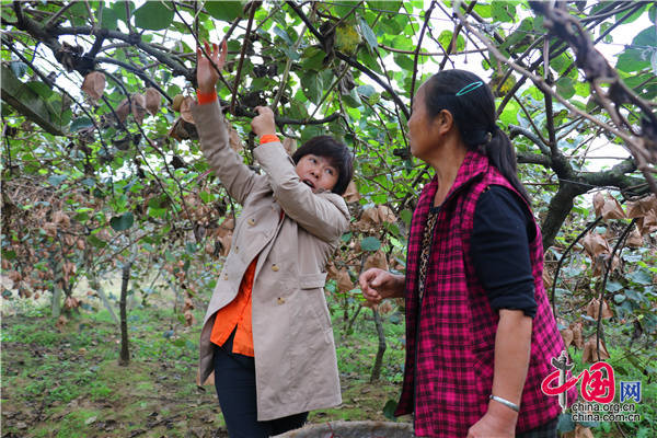 中科院武汉植物园猕猴桃专家钟彩虹(右),现场指导蒲江村民猕猴桃种植技术。王振红摄