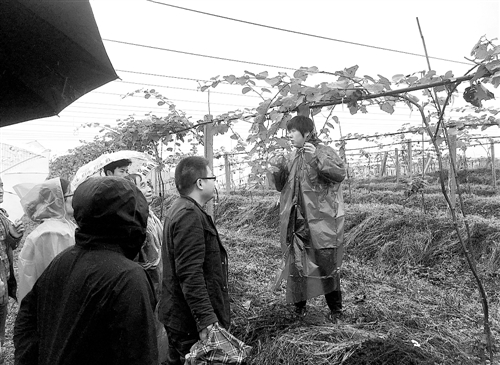 钟彩虹冒雨在猕猴桃园为果农讲解种植技术。