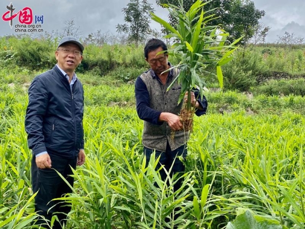 中科院地化所余德顺(左)与村里的种植大户李进(右)讨论今年小黄姜的长势