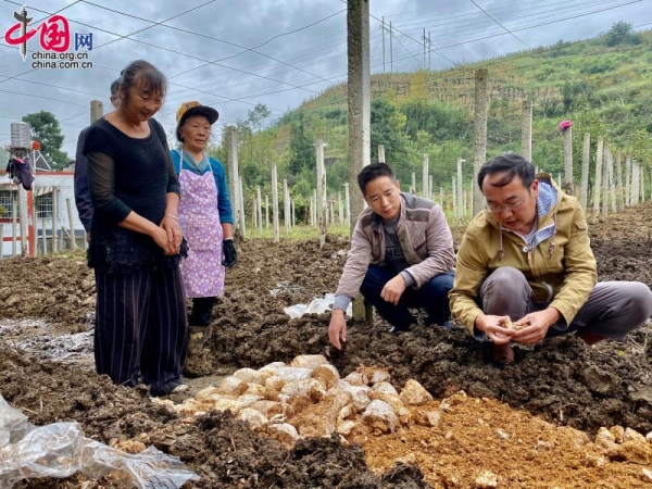 来自中科院昆明植物所的专家于富强(右)指导院坝村村民种植食用菌