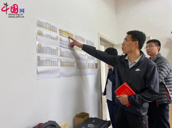院坝村第一书记田通(左)为记者介绍贫困户名单及信息,其中标黄的是今年待脱贫的53户建档立卡贫困户