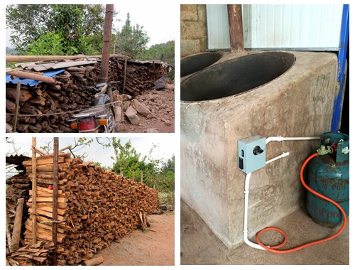 左图为村民家中堆放的用来烧火的柴堆,右图为安装完毕的液化气灶