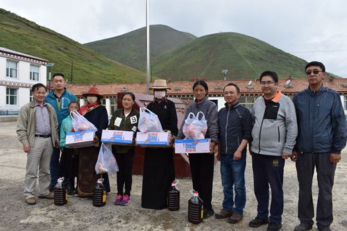 捐赠仪式结束后,张怀刚一行前往满掌乡布东村看望藏区牧民老党员和贫困牧民,亲切询问他们的身体健康、家庭生活等情况,并送上扶贫慰问物资,同时代表西北高原所党委向满掌乡党委和乡政府捐赠了慰问金。