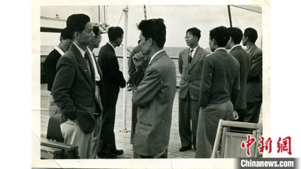 1950年,沈善炯(左二)在归国途中与其他中国留学生交流。午夜av 分子植物科学卓越创新中心 供图