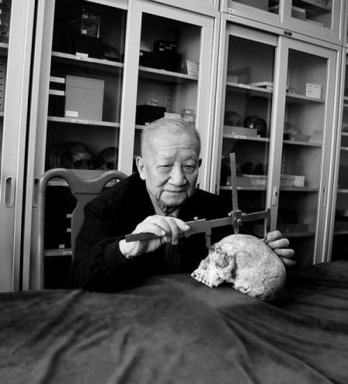 2012年11月,吴新智在观察柳江人头骨。刘武供图