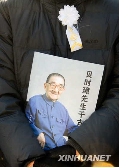 4日上午,八宝山革命公墓东礼堂气氛庄严肃穆。正厅上方悬挂着黑底白字的横幅“沉痛悼念贝时璋院士”,横幅下方是贝时璋的遗像。贝时璋遗体安放在鲜花翠柏丛中,身上覆盖着鲜红的中国共产党党旗。