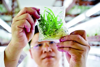 科研人员在国家(海南)热带植物隔离检疫中心组培中心检查文心兰植株生长情况。新华社发