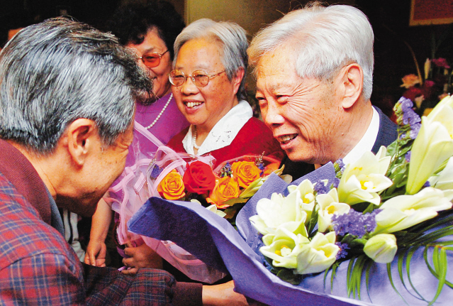 郝水(右一)80岁生日时,接受学生献花