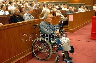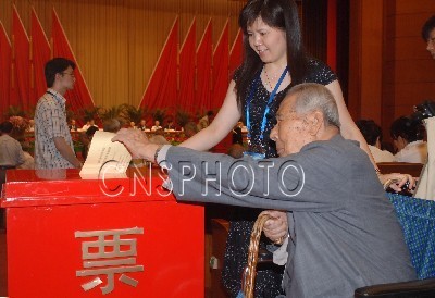 杨起坐着轮椅车参加第十四次院士大会并投票