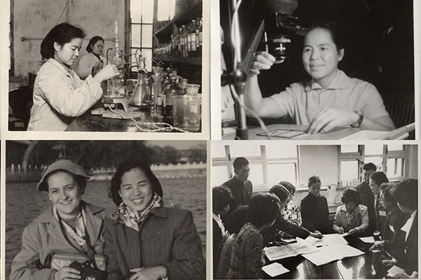 左下:1956年,与捷克专家涅麦茨院士一起泛舟北海 右下:1977年,与到访的日本妇女科研工作者讨论问题)