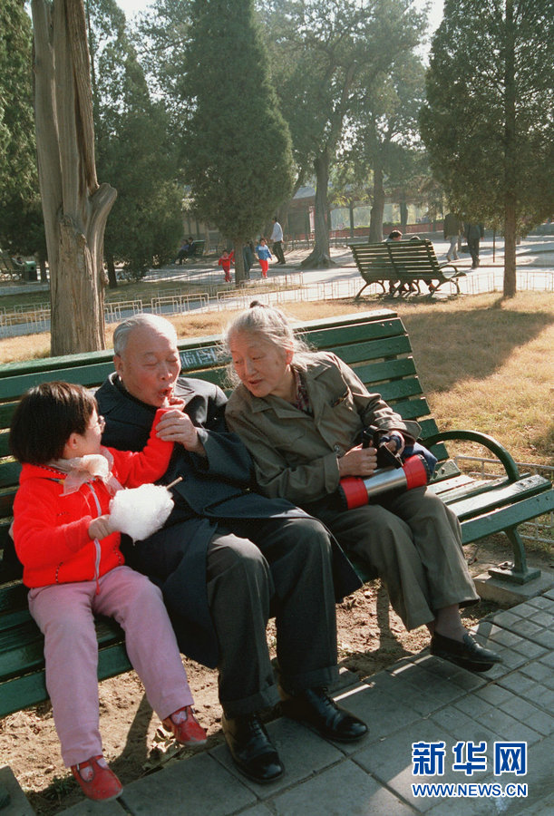 钱三强和何泽慧及小孙女在北京中山公园