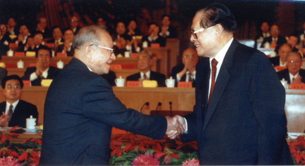 1999年9月18日,在“两弹一星”表彰大会上与江泽民同志握手