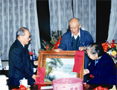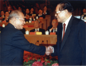 1999年9月18日,在“两弹一星”表彰大会上与江泽民同志握手
