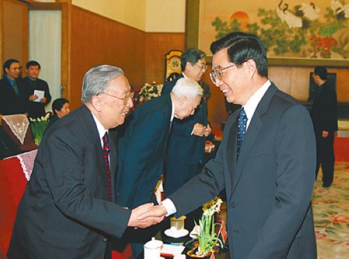 2002年2月8日,中共中央在北京中南海举行党外人士迎春座谈会。胡锦涛同志与吴阶平同志亲切交谈。
