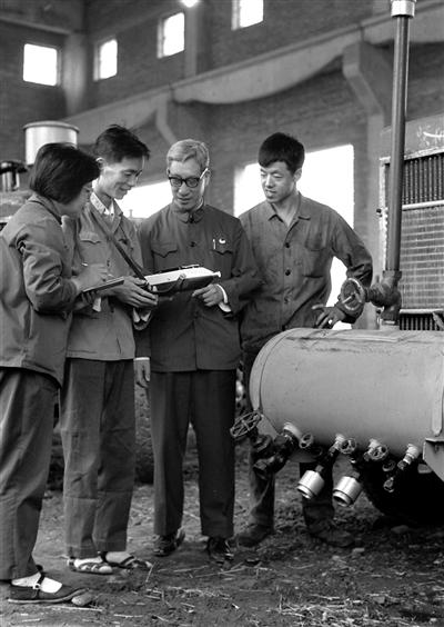 1978年,马大猷(右二)和研究人员在北京第一通用机械厂了解扩散消声器情况