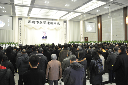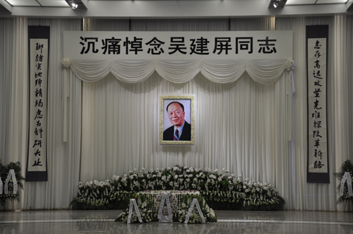 告别仪式大厅里庄严肃穆。“志存高远 攻坚克难探改革新路,脚踏实地 殚精竭虑为科研大业”巨幅挽联悬挂两旁,左右两个大屏幕滚动播放着吴建屏先生的纪念短片。
