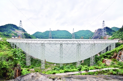 俯瞰坐落于喀斯特地貌中的500米口径球面射电望远镜全貌。秦刚摄 光明图片/视觉中国