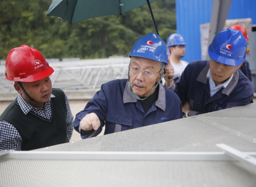 2015年大窝凼施工现场,南仁东指导反射面单元拼装工作