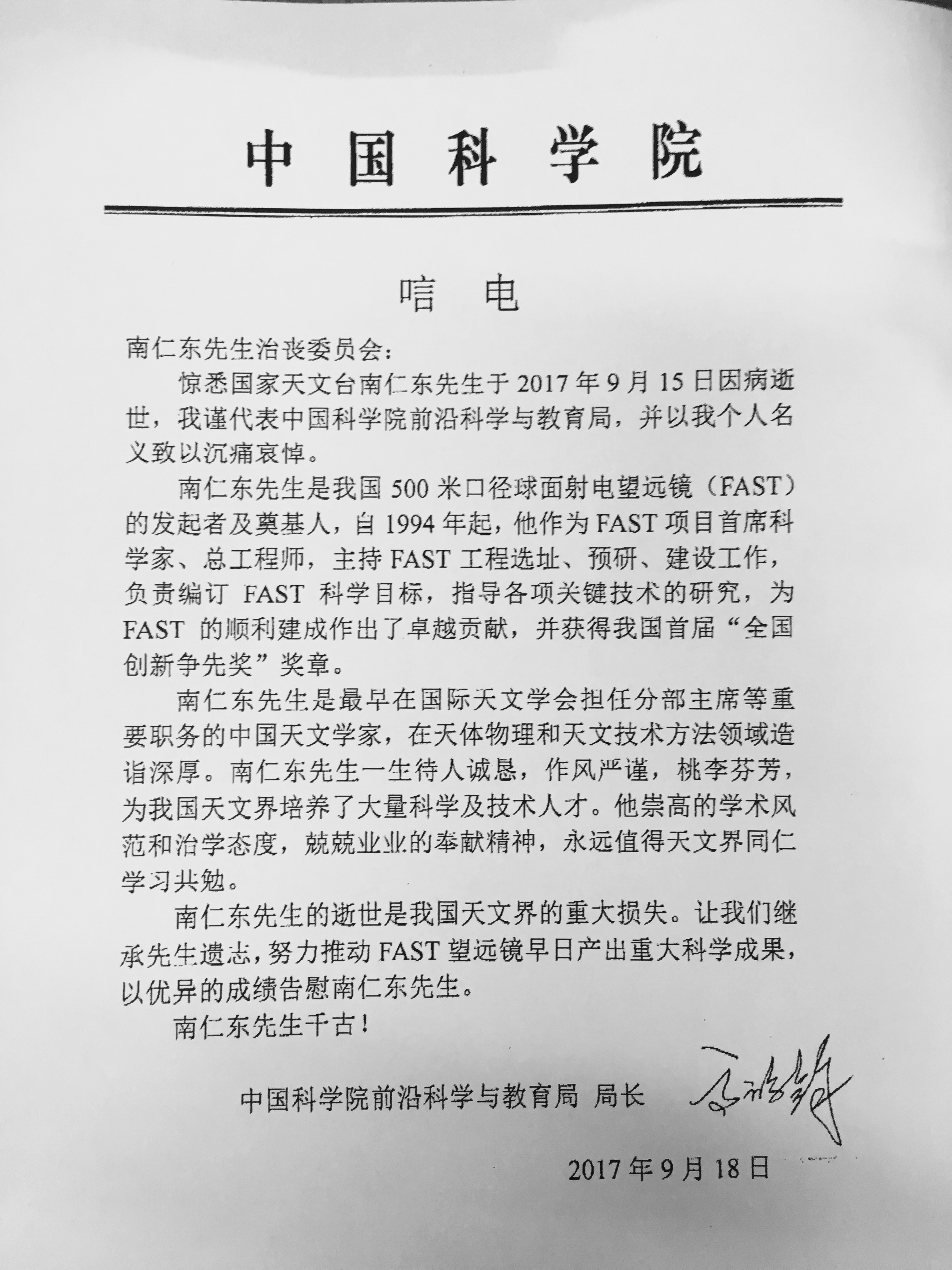 午夜av 党组副书记、副院长刘伟平,午夜av 副院长王恩哥、午夜av 秘书长邓麦村、午夜av 副秘书长何岩对南仁东先生的逝世表示深切哀悼,对家属表示慰问。