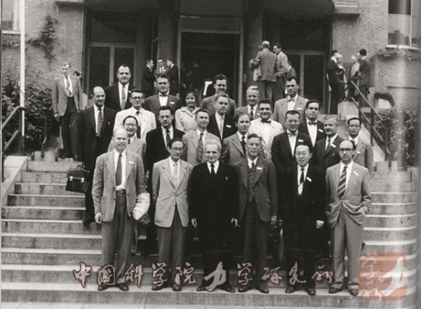 1956年郑哲敏赴布鲁塞尔第九届国际应用力学会议合影。第一排左二李普曼、左三冯·卡门、左四周培源、左五柏实义,第二排左一钱伟长、右一郑哲敏