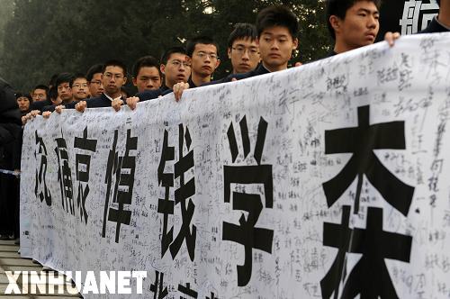 11月6日,钱学森同志中学母校北师大附中学生挽着全校师生签名横幅参加钱学森同志遗体告别仪式。当日,钱学森同志遗体在北京八宝山革命公墓火化。新华社记者 金良快 摄