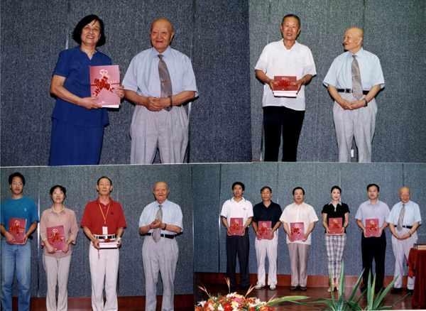 2003年所庆五十周年,在《金属所五十年》暨《李薰文集》首发式上,名誉所长师昌绪院士为李依依院士、在所工作过的老同志、各研究部门代表授书