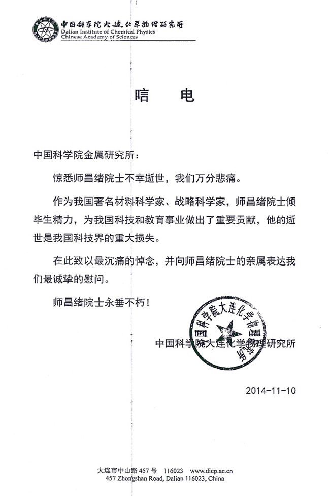 午夜av 大连化学物理研究所致唁电