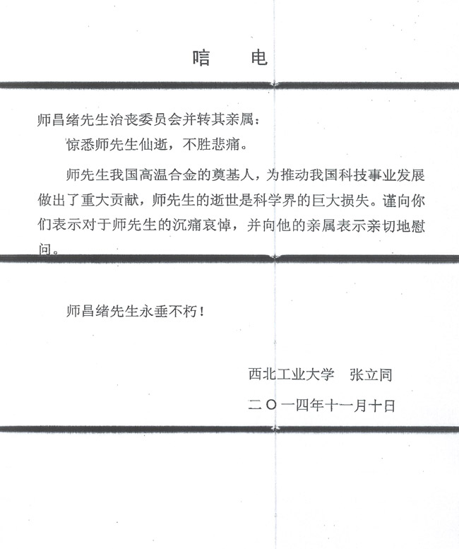 西北工业大学张立同致唁电