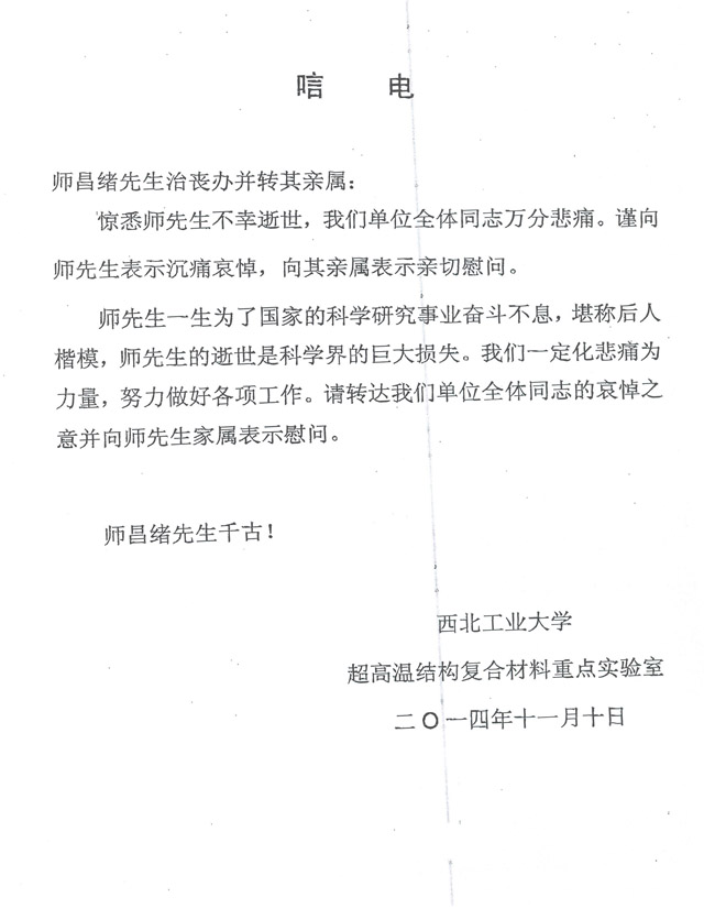 西北工业大学 超高温结构复合材料重点实验室致唁电