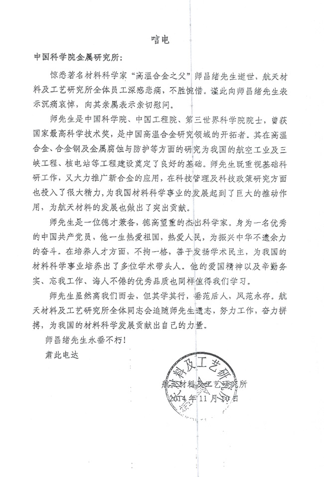 航天材料及工艺研究所致唁电