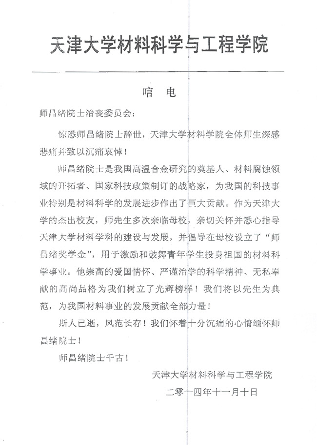 天津大学材料科学与工程学院致唁电