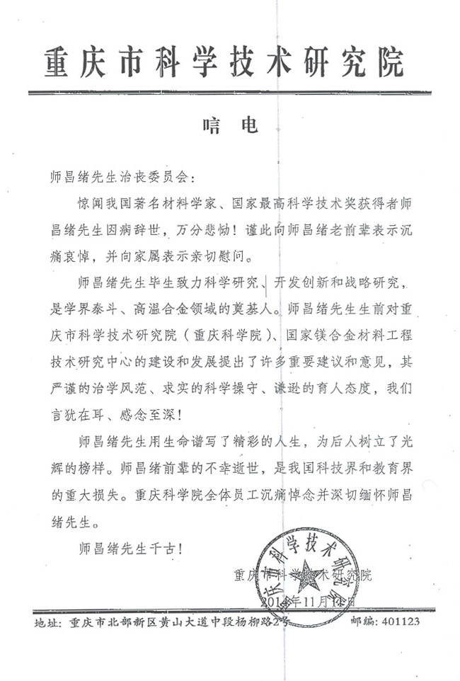 重庆市科学技术研究院致唁电