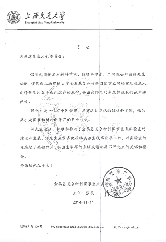 上海交通大学金属基复合材料国家重点实验室致唁电