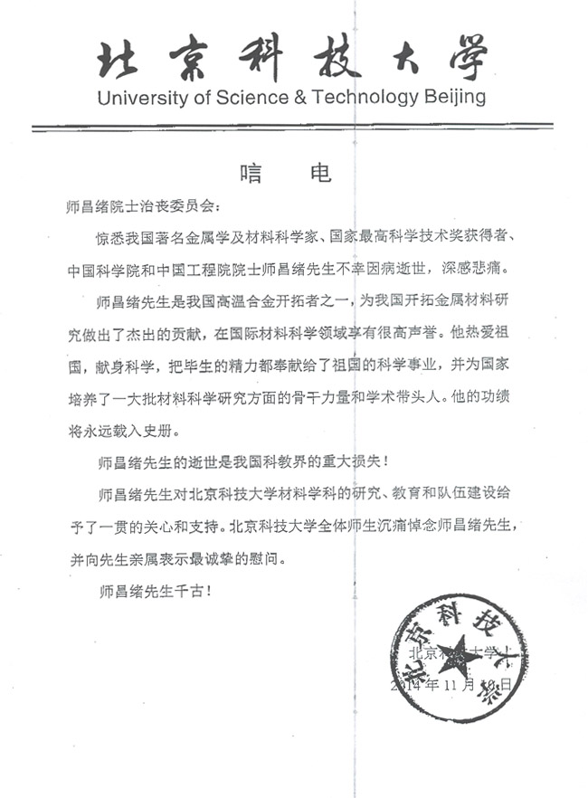 北京科技大学致唁电
