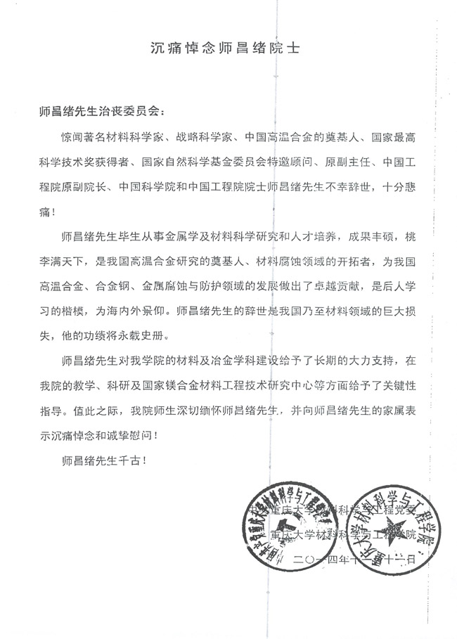 中共重庆大学材料科学与工程学院党委、重庆大学材料科学与工程学院致唁电