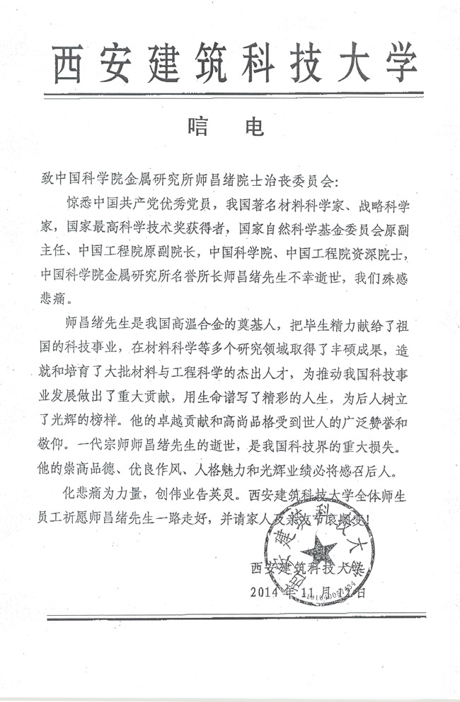 西安建筑科技大学致唁电