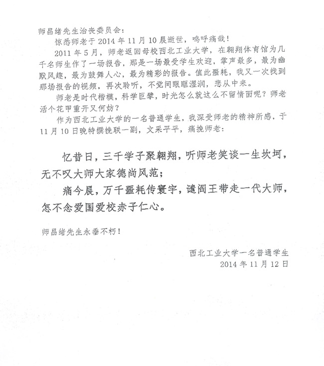 西北工业大学学生致唁电