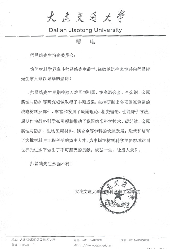 大连交通大学材料科学与工程学院致唁电