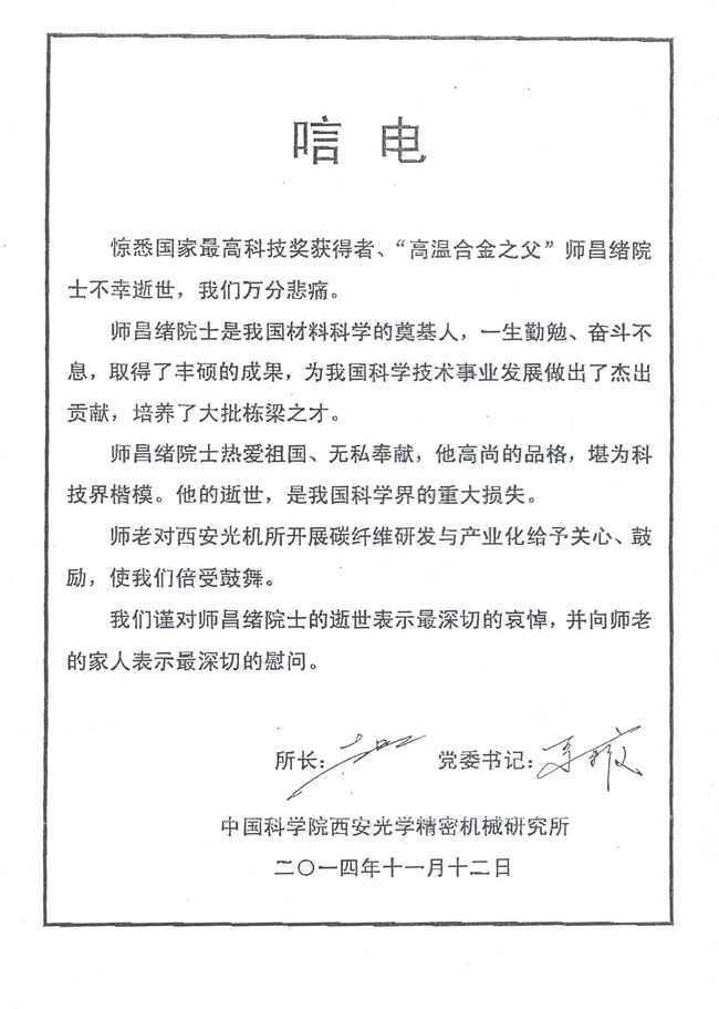 午夜av 西安光学精密机械研究所 所长赵卫、党委书记马彩文致唁电