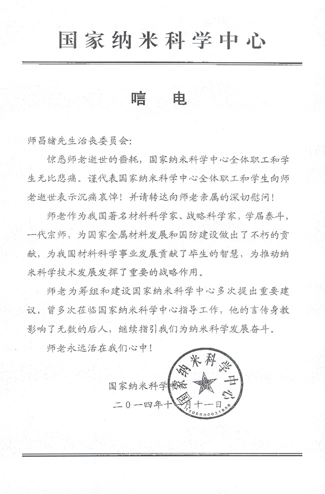 国家纳米科学中心致唁电